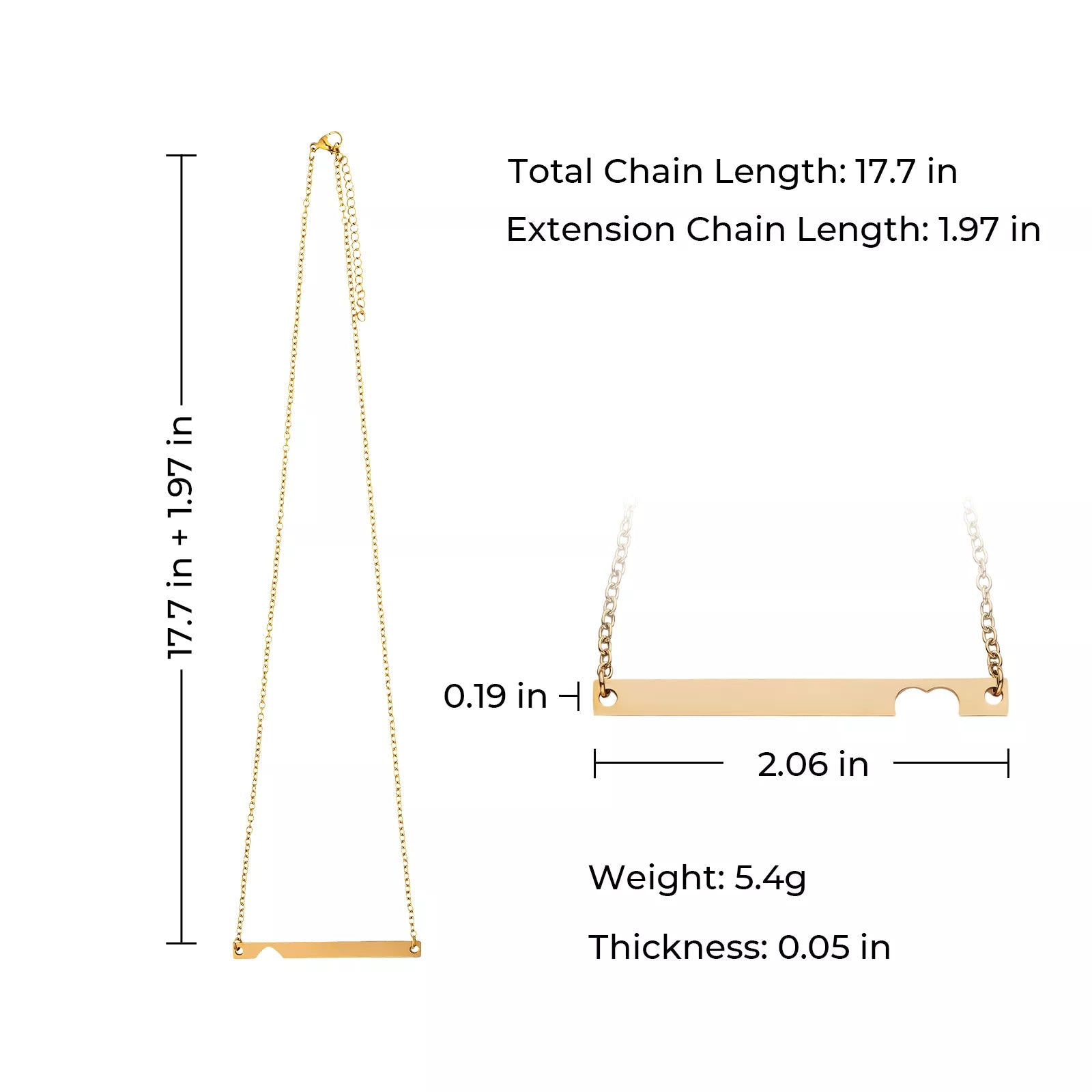 - Die Anhängergröße beträgt 52,3 mm x 4,8 mm. Die Gesamtlänge der Kette beträgt 450 mm, mit einer 50 mm Verlängerungskette.