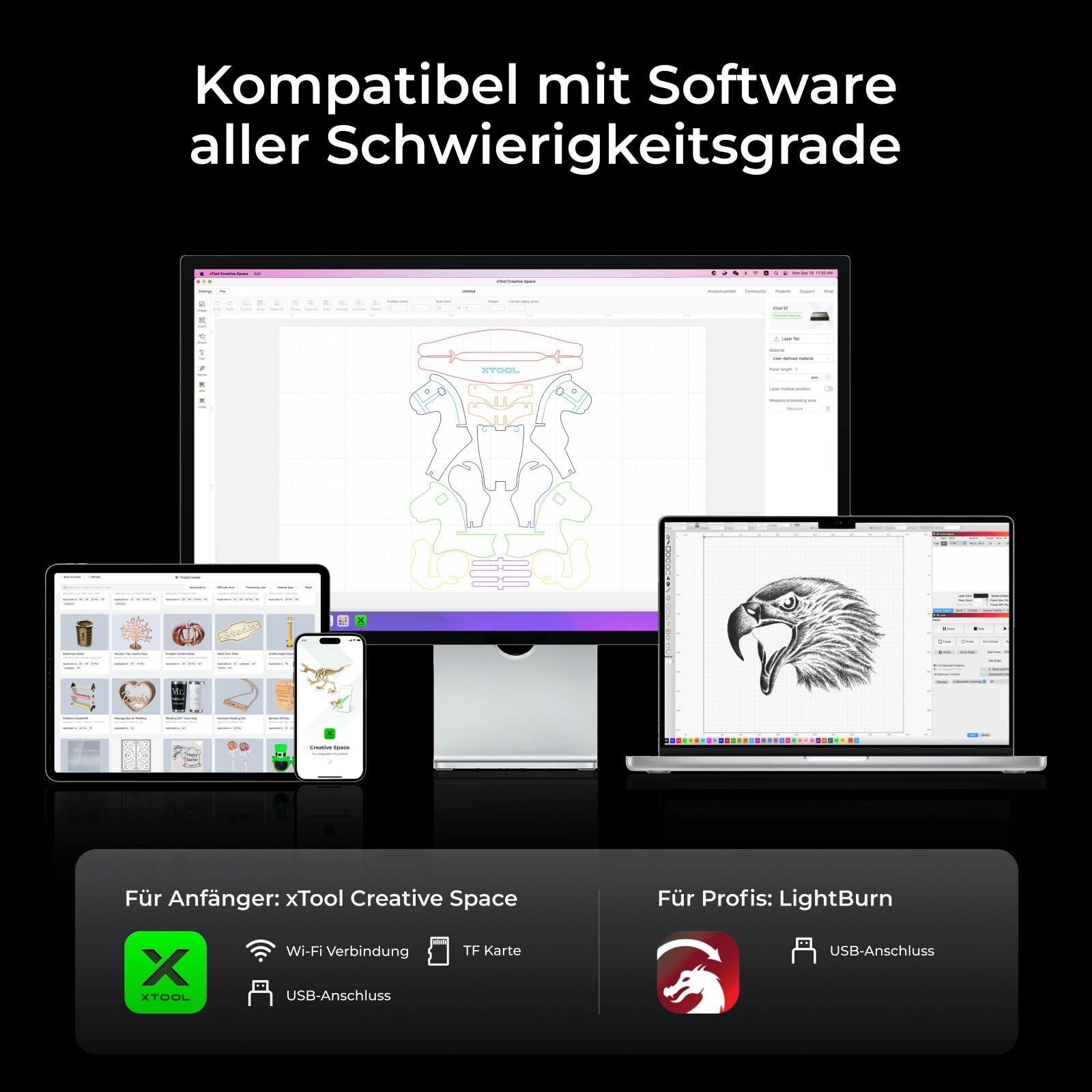 Unsere kostenlose Software XCS bietet eine Sammlung von mehr als 500 Formen, mehr als 1.000 Projekte und intelligente Funktionen wie KI-Zeichnen, Autofokus und automatisches Einrasten für Einsteiger. LightBurn wird ebenfalls für den professionellen Einsatz unterstützt.