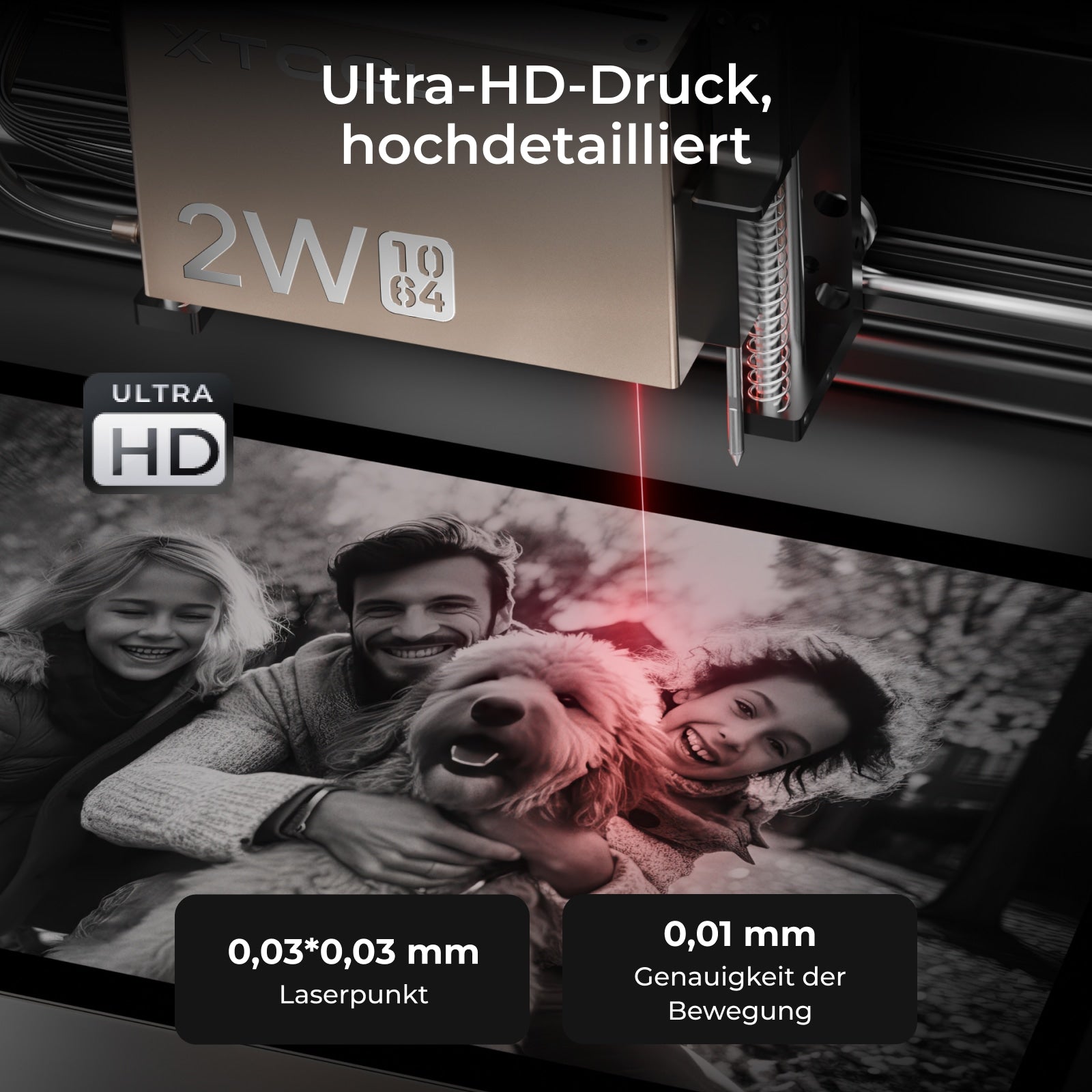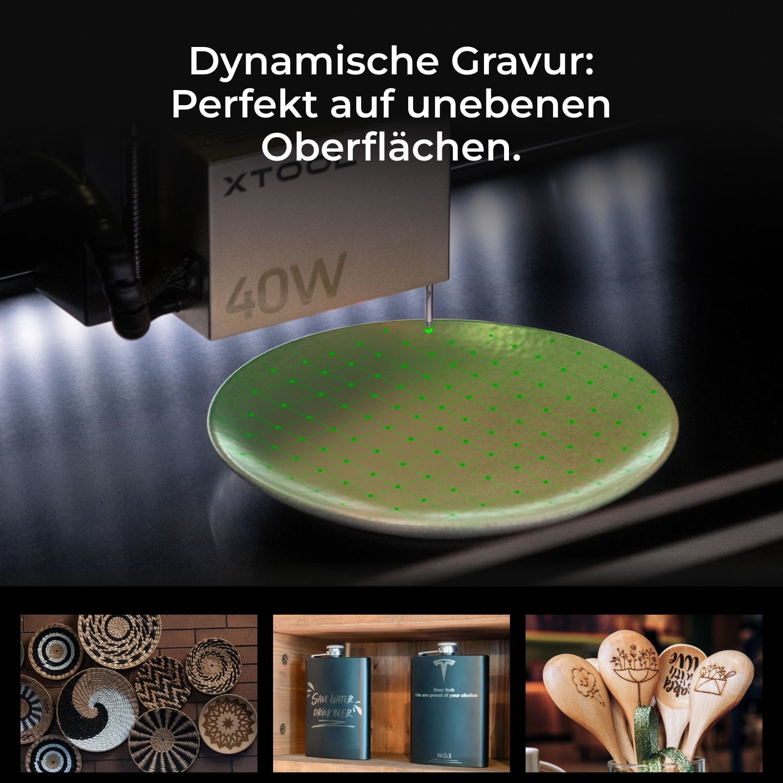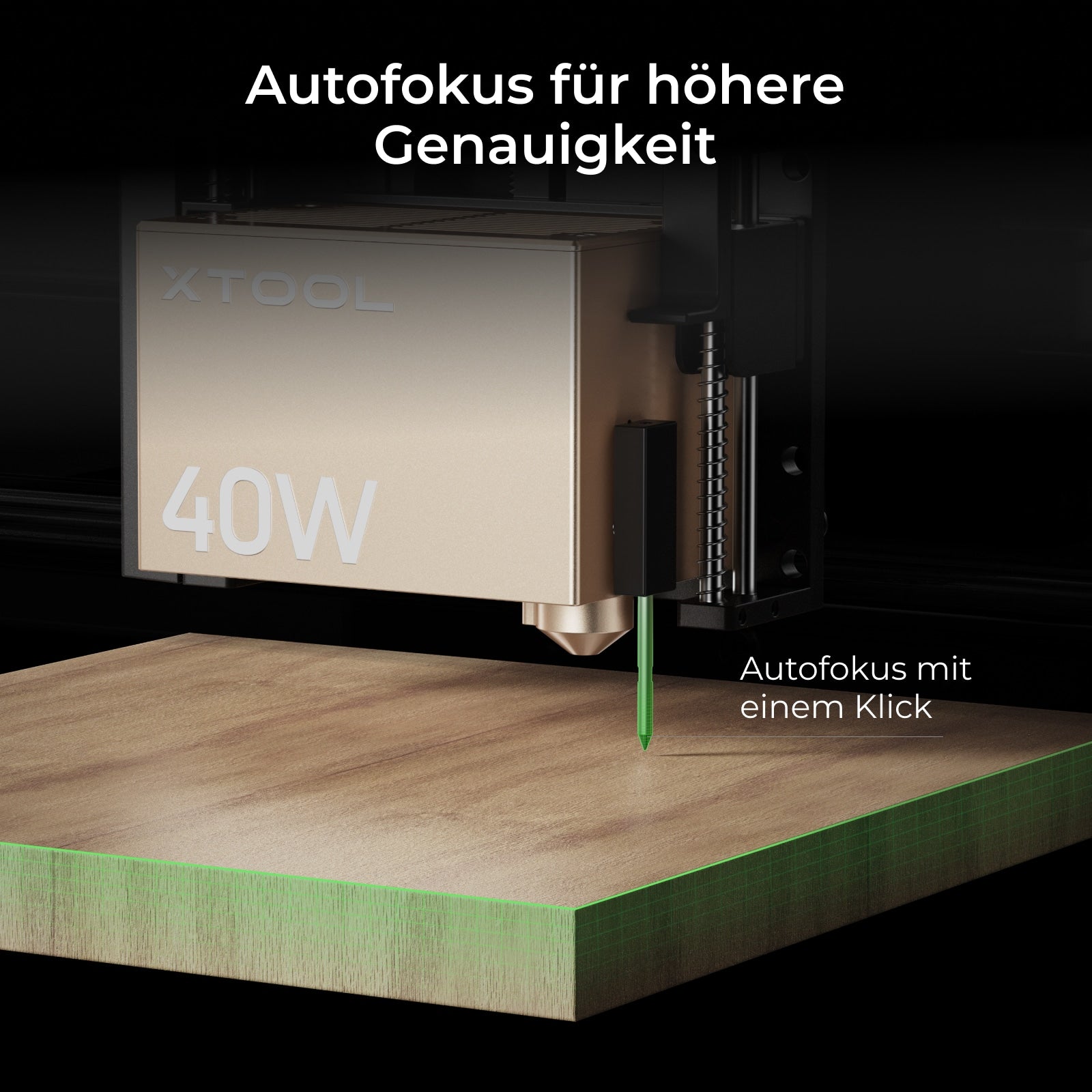 Der xTool S1 verfügt über ein hochmodernes, intelligentes Fokussiersystem für Mehrpunktfokussierung und 3D-Objektautomatisierung. Die elektrische Z-Achse verfeinert den Fokus dynamisch und sorgt für eine perfekte Gravur.