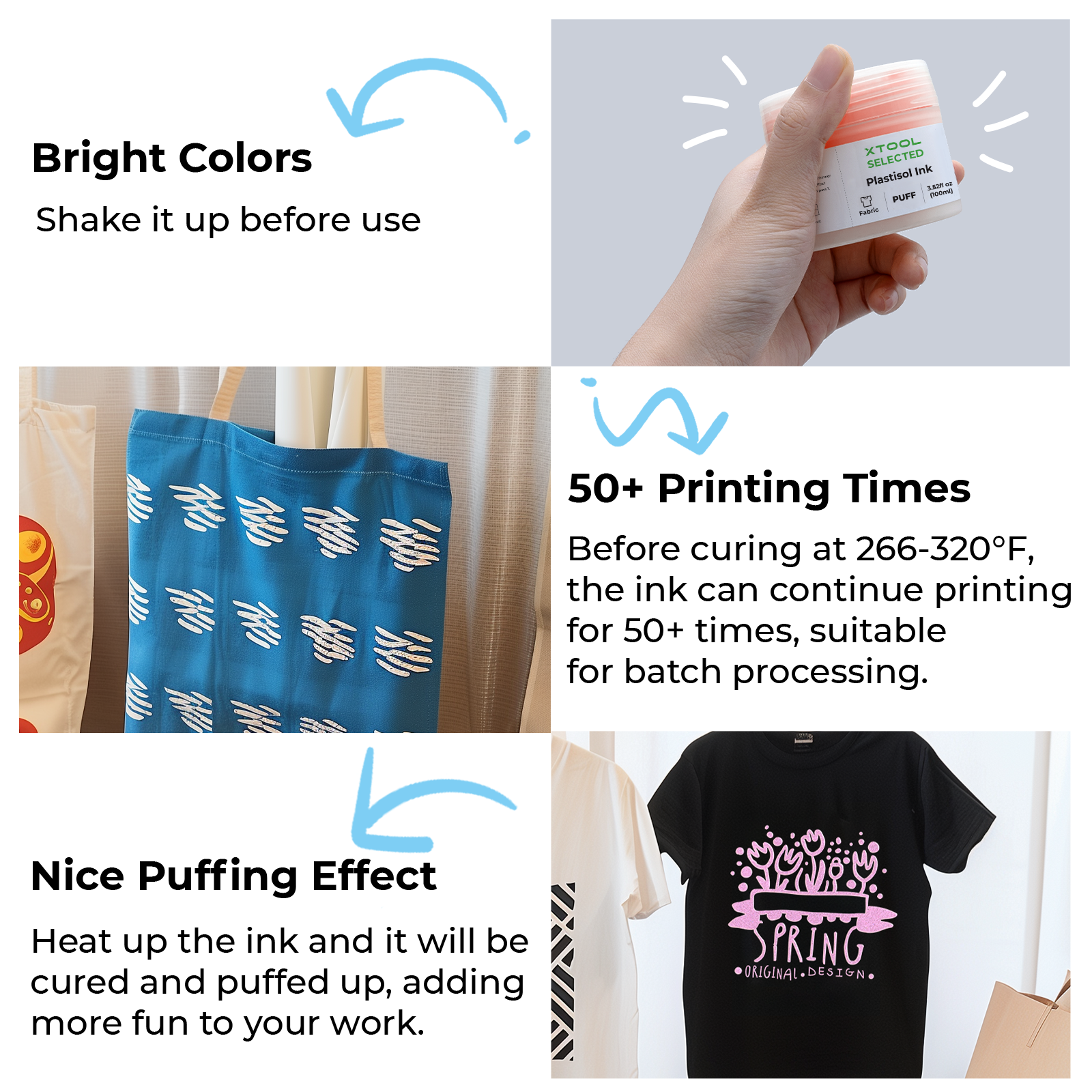 - Professionelle Puff-Plastisol Siebdrucktinten – Die bevorzugte Marke für professionelle Siebdrucker. Die Premium-Tinten bieten lebendige Farben und hervorragende Abdeckung. Puff-Plastisol-Tinte für den Siebdruck auf Stoff kann mit der xTool Heat Press verwendet werden, um einen schönen Puff-Effekt zu erzielen, wenn sie erhitzt wird.