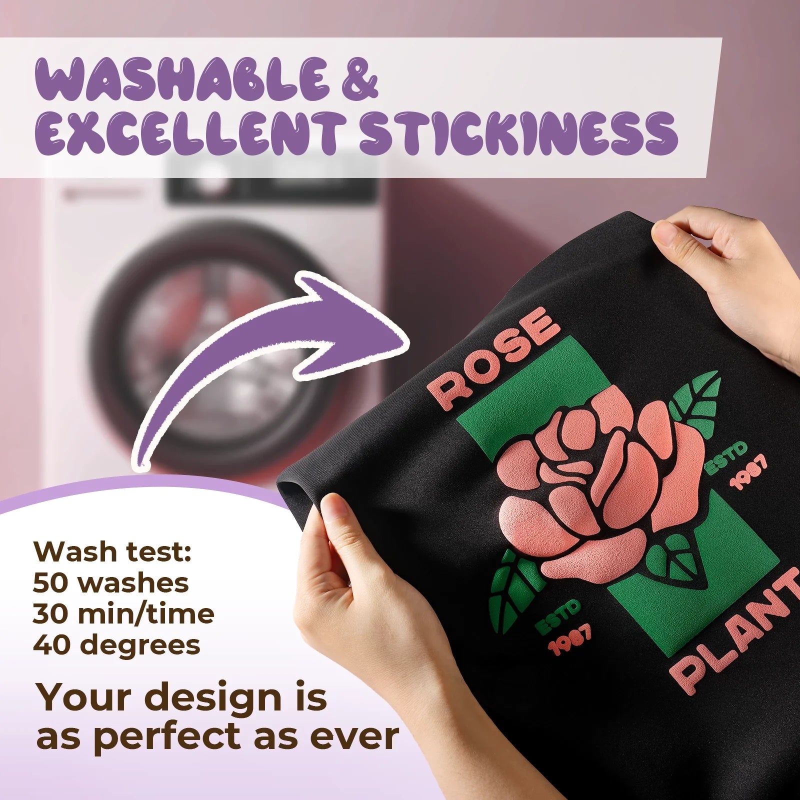 - Puff-HTV-Transferfolie dehnt sich beim Pressen und Erhitzen aus und erzeugt einen Schaum-Effekt, der ein einzigartiges erhabenes „Puff“-Finish ergibt und jedem HTV-Projekt Dimension und Persönlichkeit verleiht.