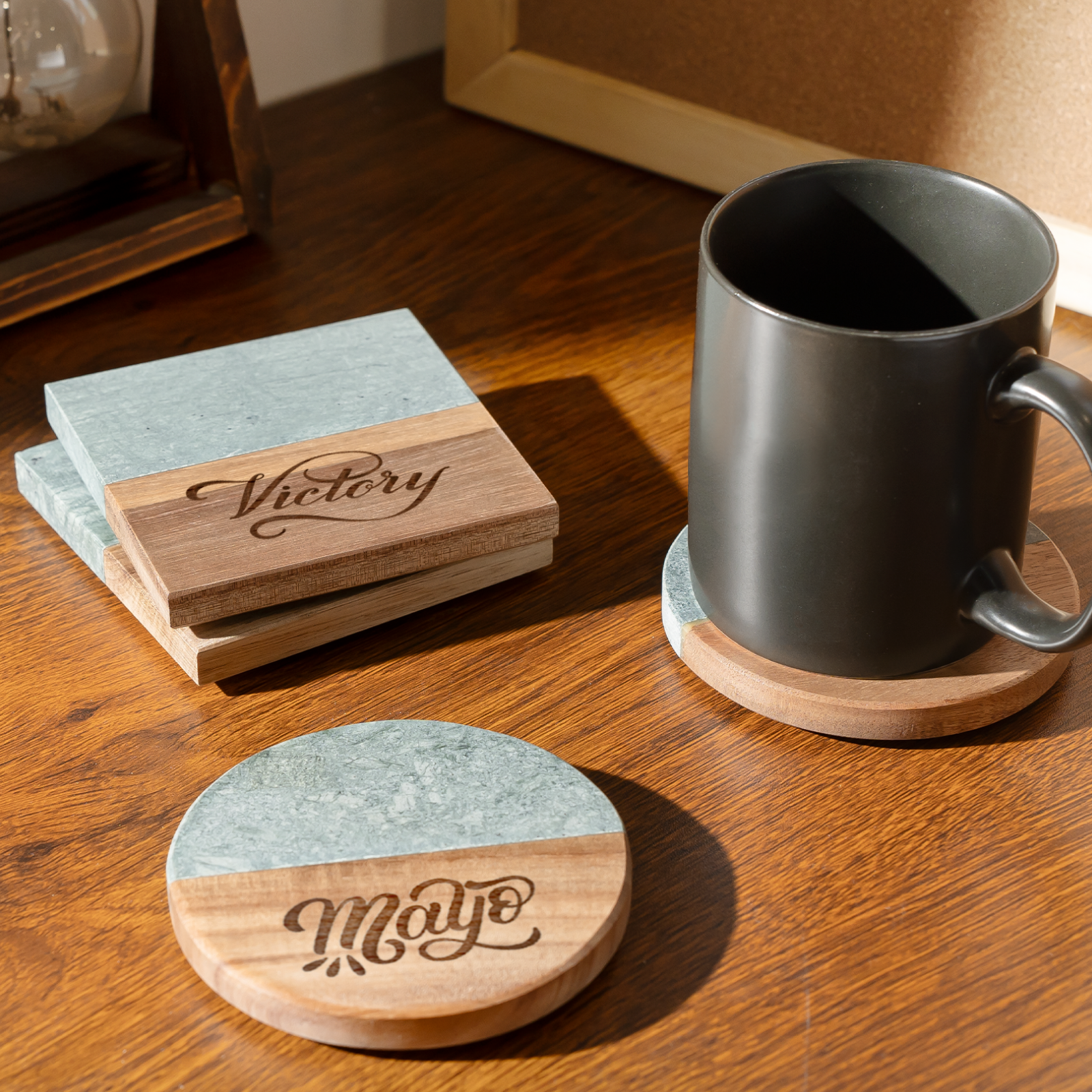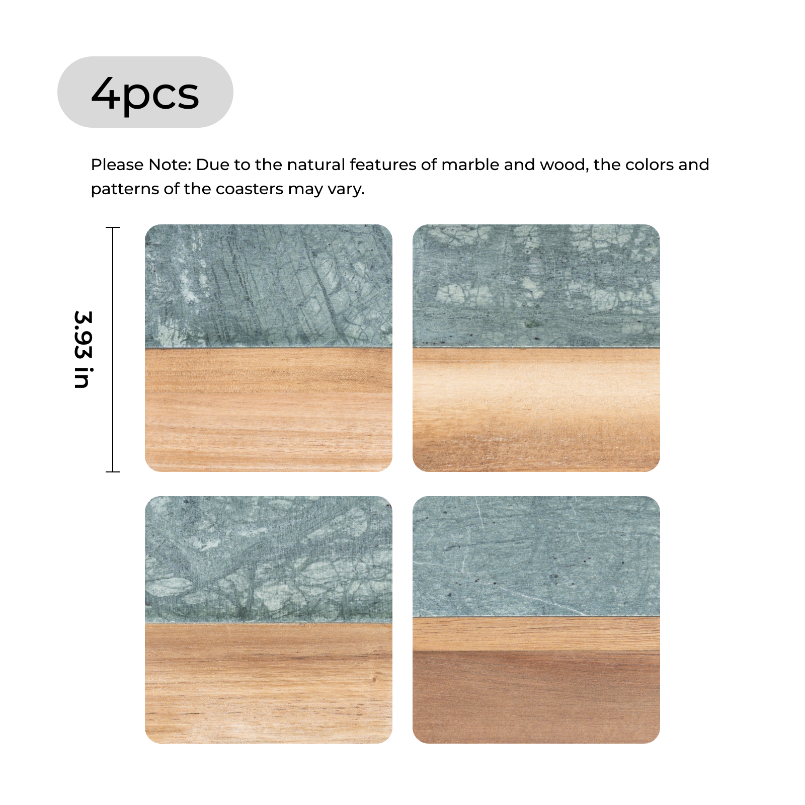 - Hinweis: Da Holz und Marmor Naturmaterialien sind, können leichte Unterschiede in Maserung und Farbe auftreten, was den einzigartigen Charme jedes Untersetzers ausmacht.