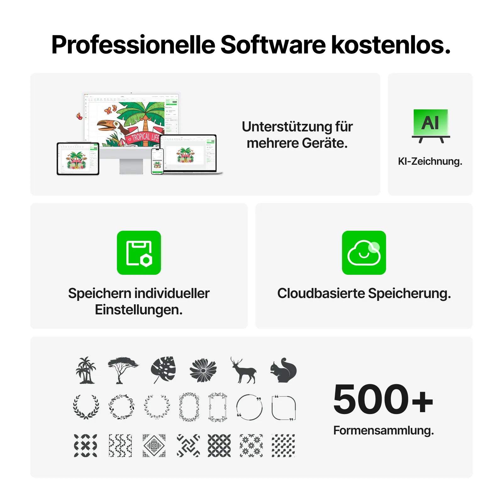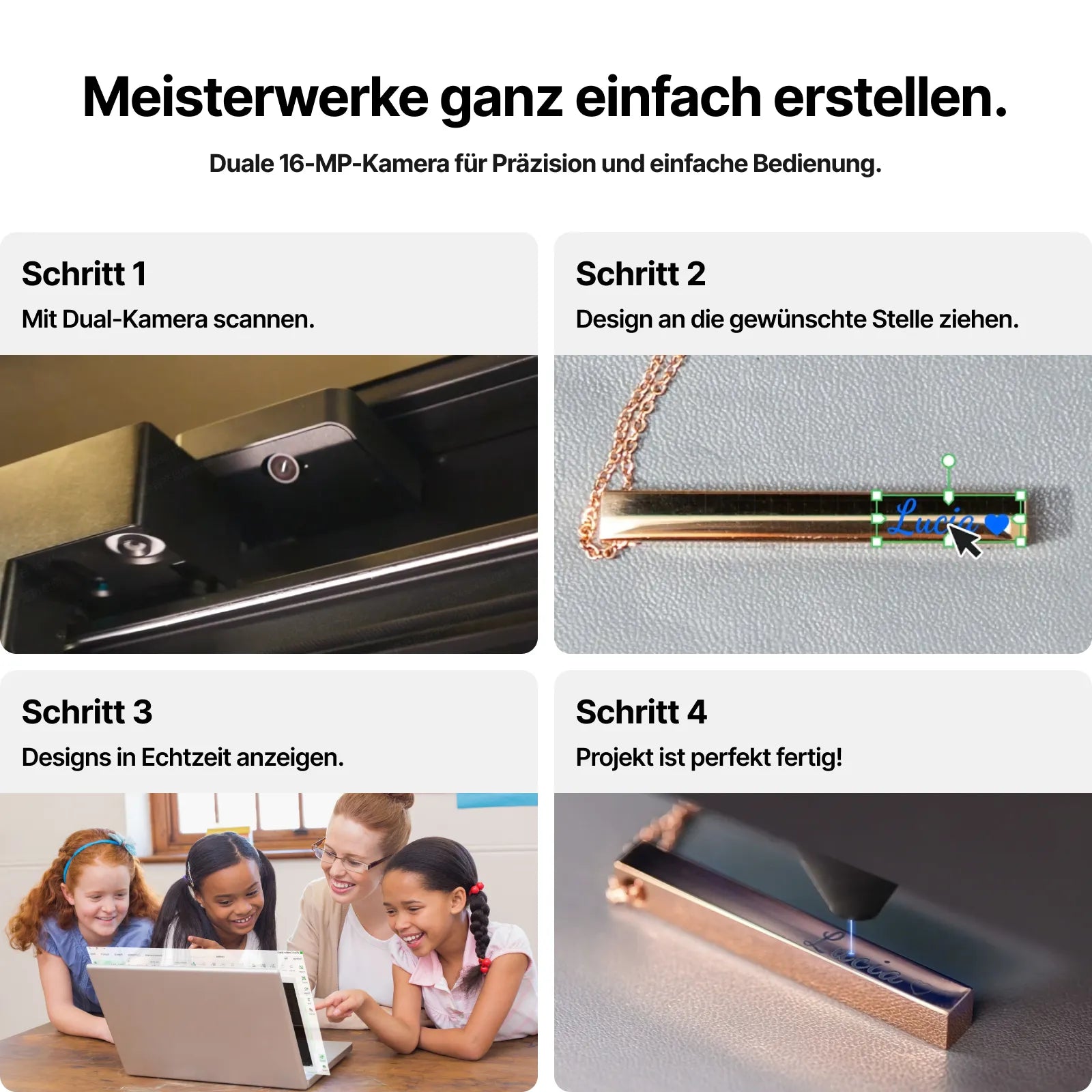 Ein-Klick-Bedienung: Bildimport, Umriss hinzufügen, Gravur- & Schneideneinstellungen, Materialeinstellungen.