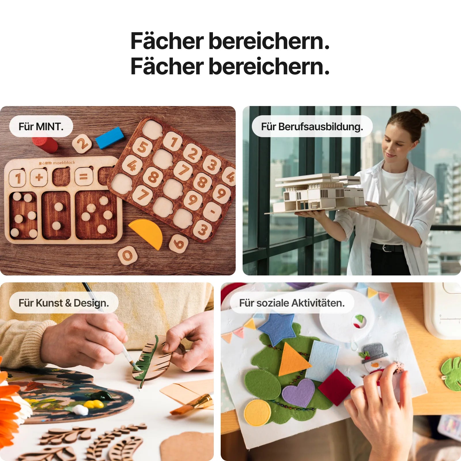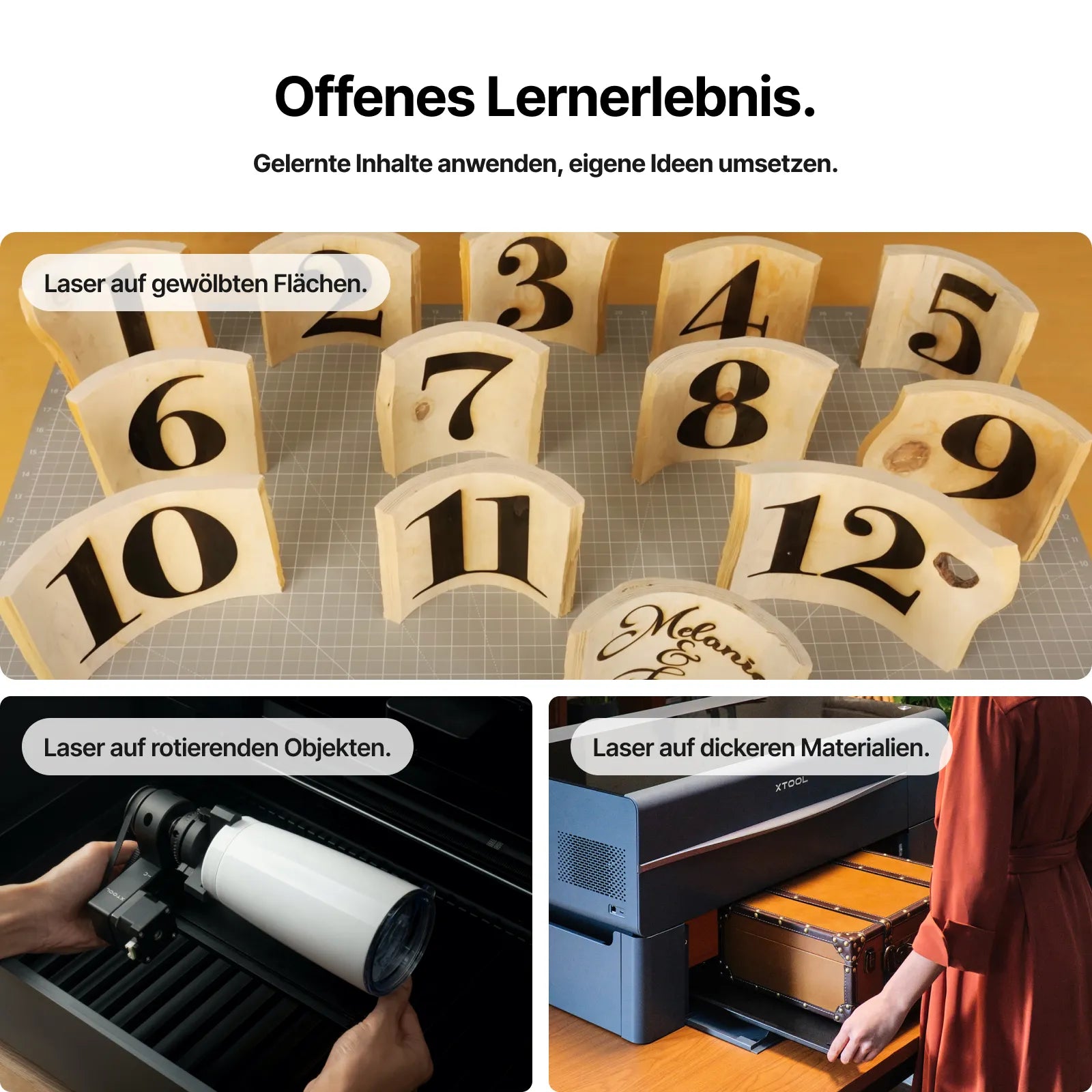 Theorie und Praxis für Schüler verbinden – intuitiv und mit Spaß lernen. Nutzen Sie den xTool P2S, um Prototypen, Anschauungsmaterialien und interaktive Lernmittel zu gestalten.
