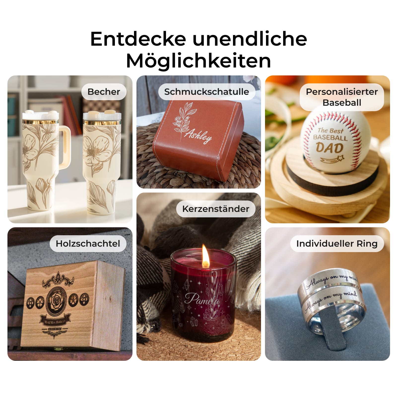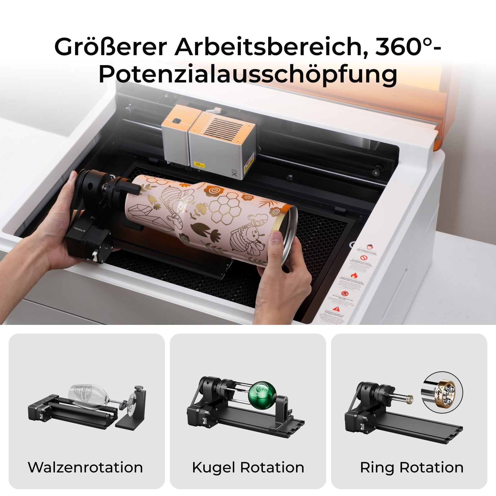 Mit dem Riser Base & Rotary Accessory wird das Gravieren auf gewölbten Oberflächen zum Kinderspiel. Sie können mühelos Ringe, Tassen, Becher, Kugeln und vieles mehr gravieren!