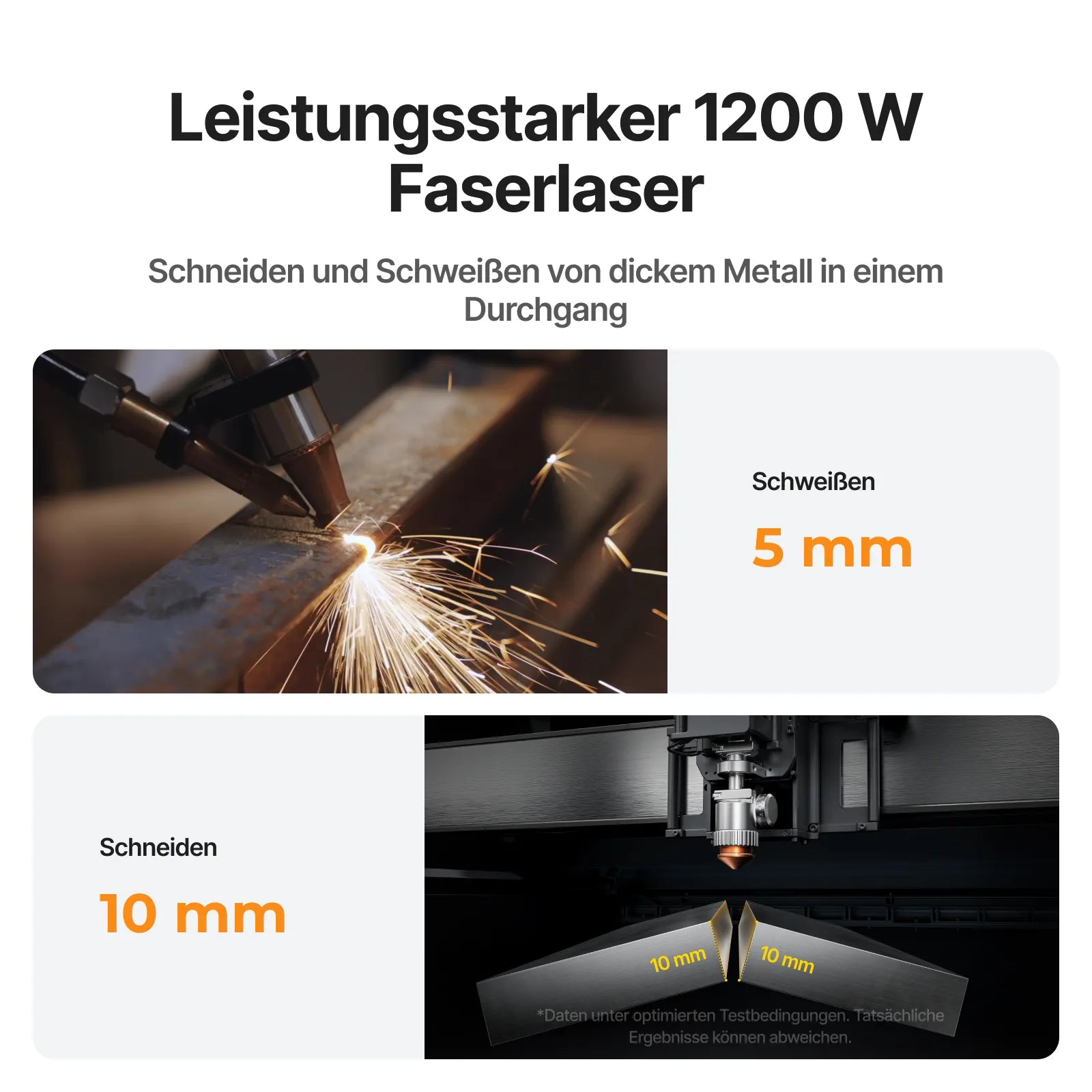 Präzise Schnitte (0,2 mm–10 mm) bei Geschwindigkeiten bis zu 400 mm/s. 8× schneller als TIG, fast kein Schleifen erforderlich. Über 108 Ein-Klick-Einstellungen, einfach zu bedienen. Erfüllt Ihre wichtigsten Anforderungen beim Schneiden und Schweißen von Edelstahl, Kohlenstoffstahl, Aluminium, Messing und weiteren Materialien.