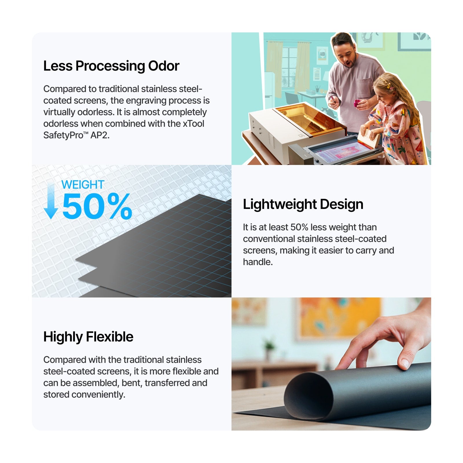 - Minimaler Geruch: Während des Gravurprozesses war bei der Polyester-Schnellgravur-Sieb praktisch kein Geruch wahrnehmbar. In Kombination mit dem xTool SafetyPro™ AP2 entsteht eine nahezu geruchsfreie Arbeitsumgebung, die den Komfort erhöht und die Produktivität steigert.