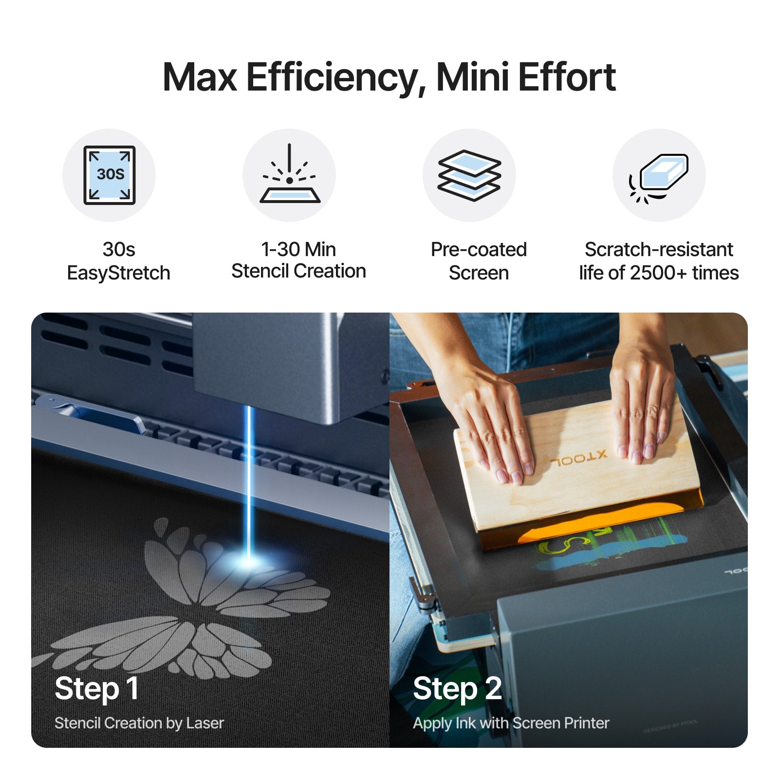 - Effiziente Verarbeitung: Polyester-Schnellgravur-Sieb benötigen deutlich weniger Zeit zur Verarbeitung als herkömmliche Siebe bei gleicher xTool-Modell- und Leistungseinstellung, mit einer durchschnittlichen Gravurzeit von nur 1–30 Minuten im Vergleich zu 5–60 Minuten bei herkömmlichen Sieben. Dies führt zu einer deutlichen Produktivitätssteigerung und hilft dir, deine Druckaufträge schneller abzuschließen.