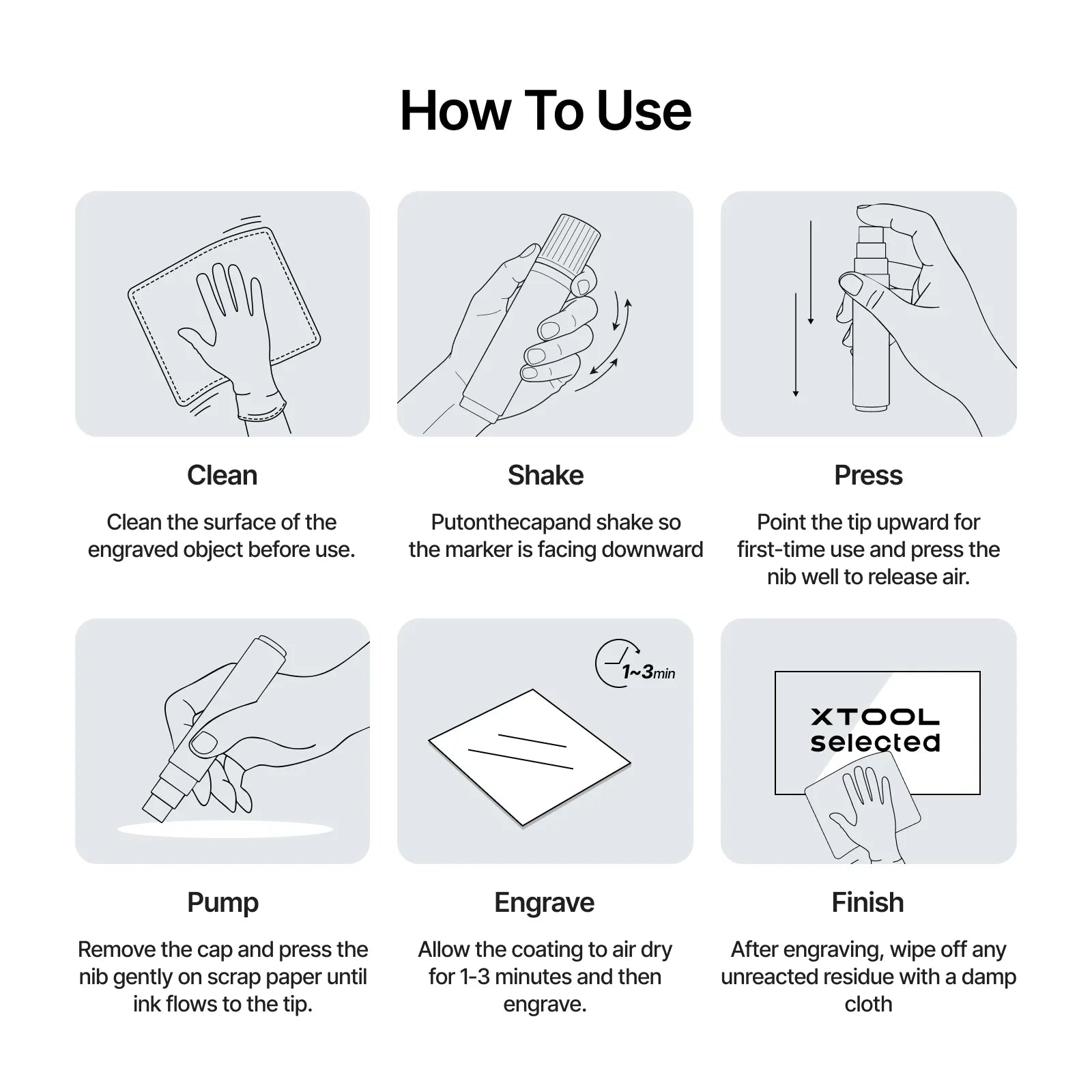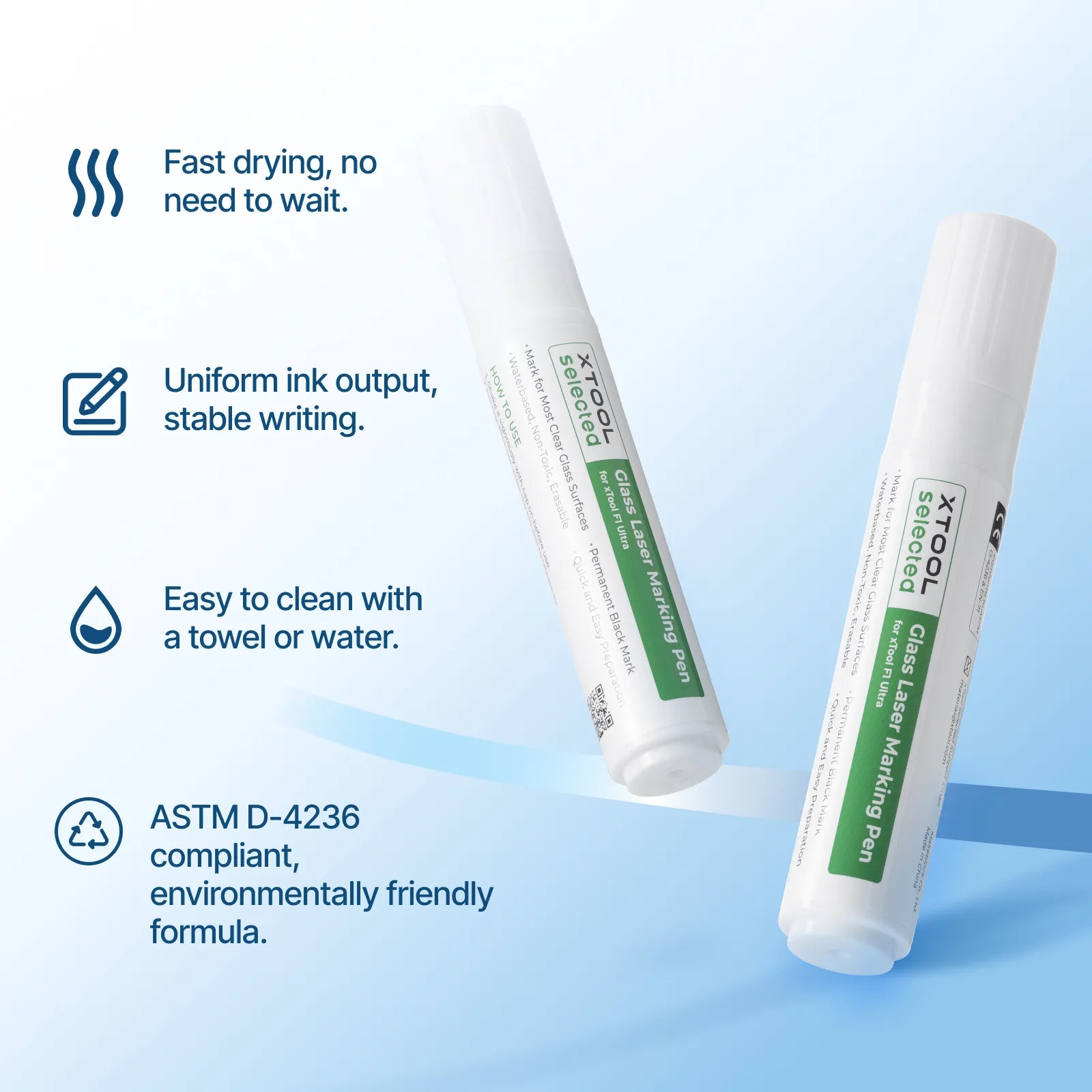 - Ein hochpräziser Markierungsstift, speziell für Glas entwickelt. Die Tinte ist beim Auftragen weiß, hinterlässt jedoch nach der Lasergravur mit dem xTool F1 Ultra ein klares, dauerhaftes schwarzes Muster.