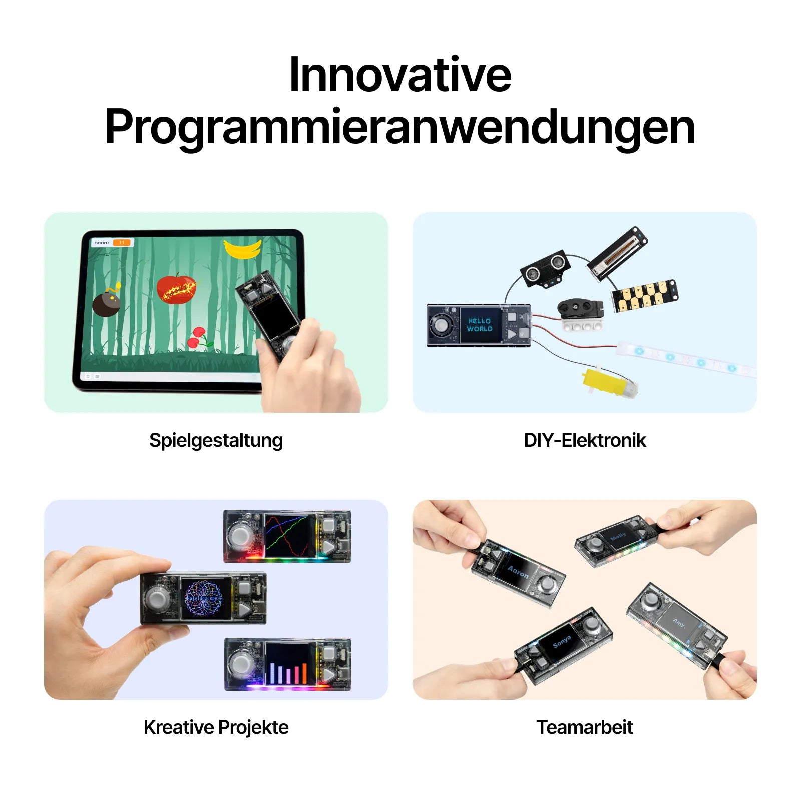 Lernen Sie, was CyberPi tun kann, um eine solide Grundlage für DIY-Programmierprojekte zu schaffen. Erstellen Sie lustige Projekte von Grund auf, wie z.B. "Intensitätsmesser" oder "Verfolgungsspiel". 100% geeignet für Anfänger