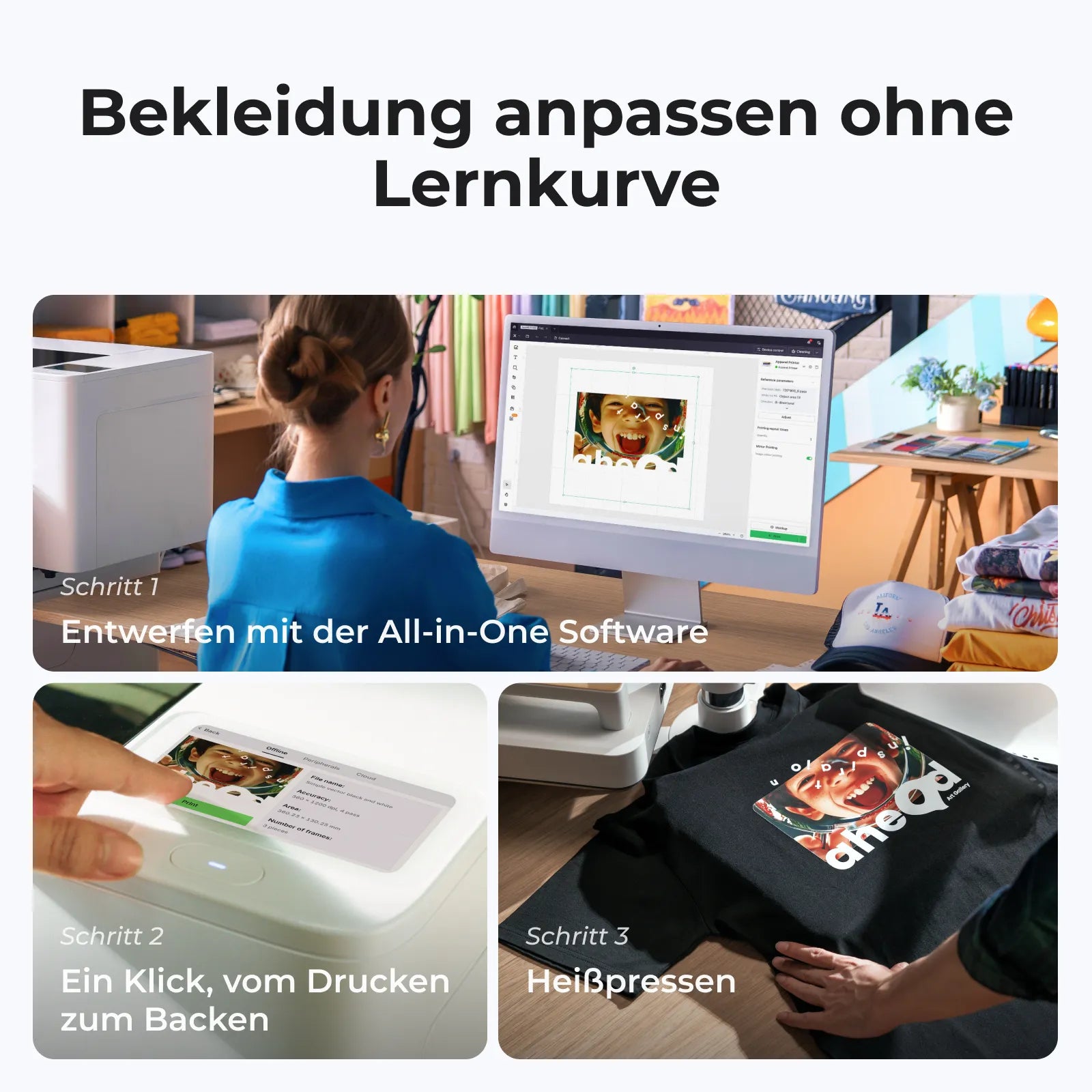 Zusätzlich haben wir die Software optimiert, sodass du alles – vom Design bis zum Druck – in einem einzigen Programm verwalten kannst, ohne wie bei herkömmlichen DTF-Druckern mehrere Tools (3–5) nutzen zu müssen.