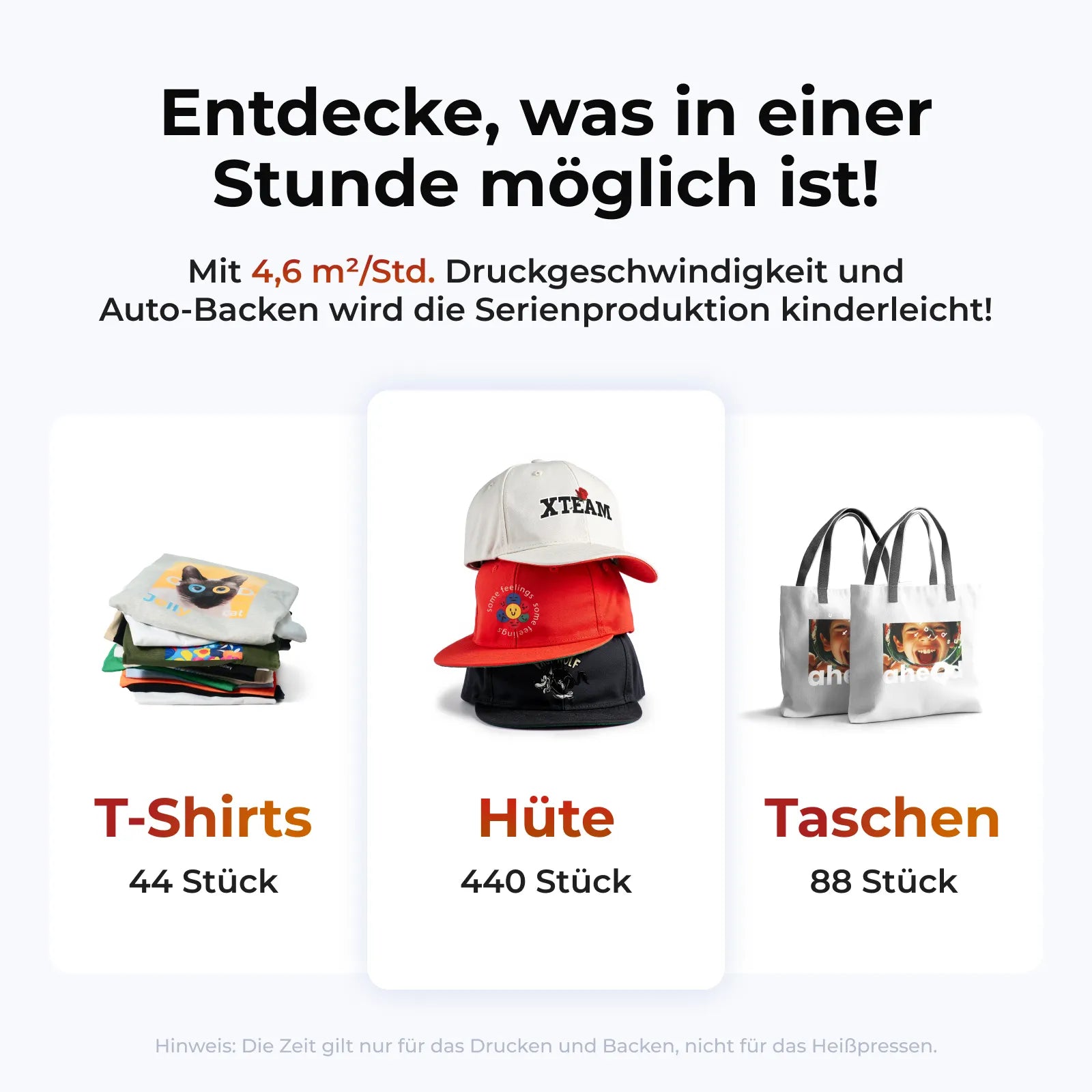 Der xTool Apparel Printer ermöglicht beeindruckende Individualisierung innerhalb weniger Minuten – sowohl für Unternehmen als auch private Vorhaben. Steigere deine Umsätze durch vor-Ort-Personalisierung, erfülle Print-on-Demand-Aufträge effizient und produziere mühelos Team-Merchandise, gestalte einzigartige Geschenke bequem von zu Hause aus. Vielseitig und benutzerfreundlich, ist er die ultimative Lösung für Textildruck – ob für geschäftliche Zwecke oder persönliche Kreativität.